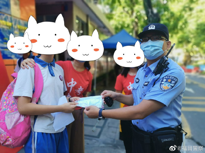 7月21日,深圳中考第二天,景田派出所社區(qū)民警一早就在各考場外為考生們保駕護航。當社區(qū)民警趙廣生看見一名忘記佩戴口罩的考生時,立即取出身上的備用口罩遞給她,使得考生順利進入考場參加考試。福田警方溫馨提醒:乘風破浪的同時,也要做到考試防疫兩不忘。少年們,下午的考試繼續(xù)加油吧!