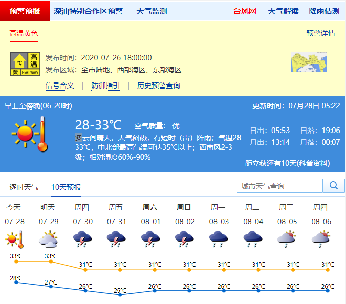 見圳客戶端?深圳新聞網(wǎng)2020年7月28日訊 根據(jù)深圳氣象局官方消息,7月28日白天多云間晴天,天氣悶熱,有短時(shí)(雷)陣雨;氣溫28-33℃,中北部最高氣溫可達(dá)35℃以上;西南風(fēng)2-3級(jí);相對濕度60%-90%。