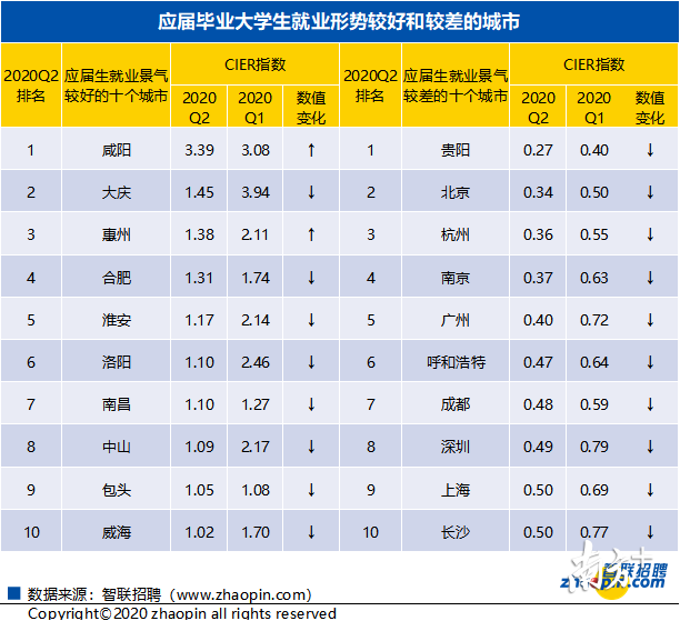 《報(bào)告》顯示,二季度應(yīng)屆生CIER指數(shù)較高的城市為二、三線城市,例如,咸陽、大慶、惠州、合肥和淮安等,這些城市的CIER指數(shù)均要高于1。而在應(yīng)屆生就業(yè)景氣較差的城市中,北上廣深等一線城市,以及杭州、南京、成都等新一線城市的應(yīng)屆生CIER指數(shù)相對(duì)較低,就業(yè)競爭相對(duì)激烈。