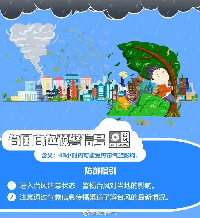 深圳市氣象臺于2020年07月31日17時05分在全市發(fā)布臺風白色預警,南海熱帶低壓已于31日14時生成,全市進入臺風注意狀態(tài),目前全市大風藍色預警同時生效中,請遵照海事、漁政部門的防風指令或通知,做好避風準備。