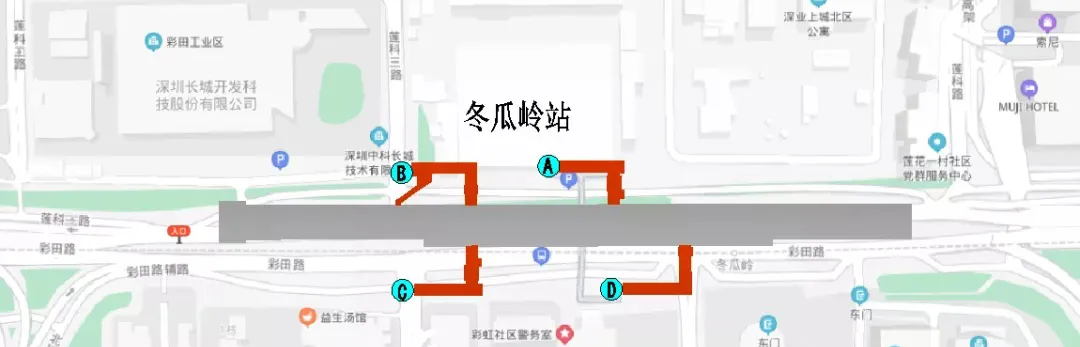 其中,A口位紅荔路,靠近四川大廈;E口位于上步路東側(cè),靠近通新嶺小區(qū);F口位于上步路西側(cè),靠近深勘大廈。