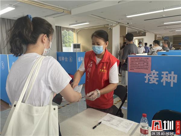 在新冠疫苗布心市場臨時(shí)接種點(diǎn),前來接種的市民有序排隊(duì),來自社區(qū)的工作人員和義工在各自的崗位上做好指引工作,引導(dǎo)市民了解疫苗接種的詳情和注意事項(xiàng),并幫助他們在手機(jī)上提前進(jìn)行了信息預(yù)登記,耐心為市民答疑解惑。65歲的義工成寶梅是一名深圳市五星級義工,此刻的她正在接種區(qū)域引導(dǎo)市民去接種臺,從早上九點(diǎn)到下午六點(diǎn),她就這么一直站在崗位上,精神抖擻,笑臉迎人,絲毫不感覺累。成寶梅說道,“這個(gè)歲數(shù)了還能為這個(gè)社會發(fā)揮一些余熱,這是很有意義的一件事情,能聽到別人說的一聲謝謝,感覺什么都值得了。”