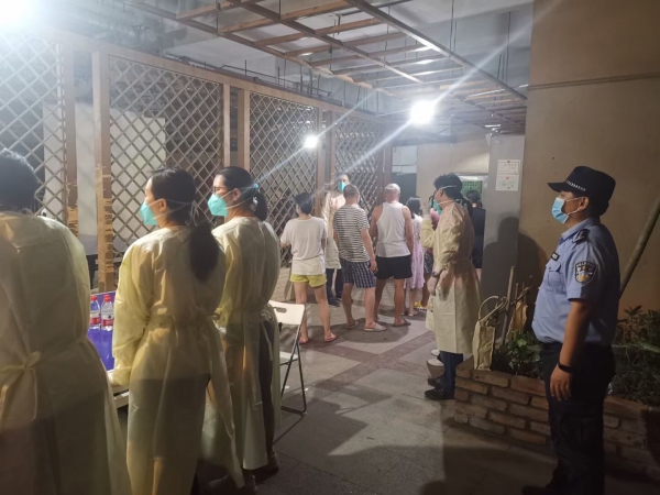 “我們已經(jīng)協(xié)調(diào)社康開始發(fā)號了,不要急,請耐心等待?!惫S崗社康外,一名民警正頂著烈日揮汗如雨,耐心地給居民進行解釋,警服肩頸處可見一道道汗?jié)n。