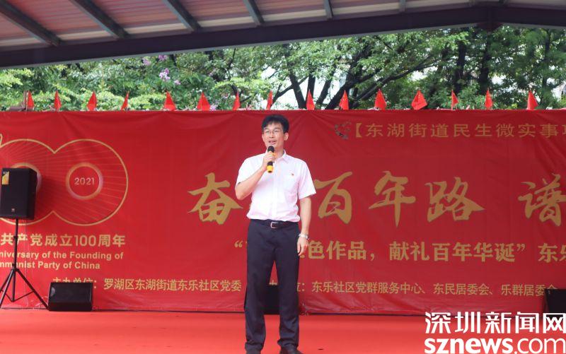 讀特客戶端·深圳新聞網(wǎng)2021年7月30日訊(見習(xí)記者 邱婕 通訊員 黃小花)百年征程波瀾壯闊、百年初心歷久彌堅、百年成就催人奮進(jìn)、百年歌聲唱響今天。7月30日上午,“百幅紅色作品,獻(xiàn)禮百年華誕”東樂社區(qū)建黨100周年慶祝活動在東樂花園文化廣場舉行。東湖街道黨工委副書記、辦事處主任劉慧堅,黨工委副書記、人大工委主任謝統(tǒng)敏,東湖街道二級調(diào)研員、東樂社區(qū)第一書記曾列文,東湖街道辦事處副主任李民,羅湖區(qū)退役軍人事務(wù)局副局長何朝陽,東樂社區(qū)黨委書記劉芳,東樂社區(qū)社工與義工及廣大居民朋友400余人參與此次活動。