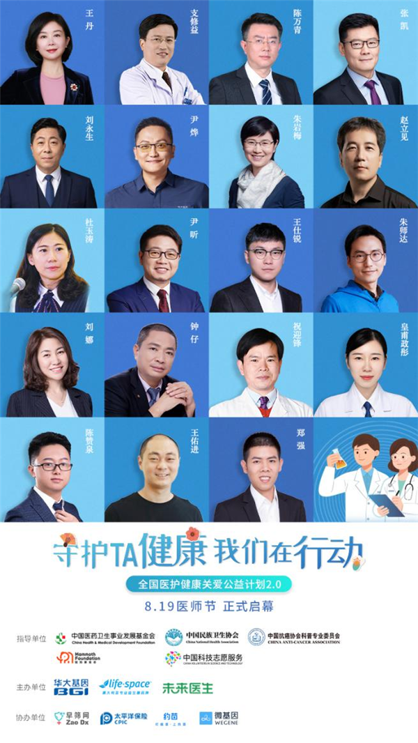 此次公益由中國醫(yī)藥衛(wèi)生事業(yè)發(fā)展基金會(huì)、中國民族衛(wèi)生協(xié)會(huì)、中國抗癌協(xié)會(huì)科普專業(yè)委員會(huì)、深圳猛犸公益基金會(huì)等機(jī)構(gòu)指導(dǎo),華大基因、Life-Space、未來醫(yī)生聯(lián)合主辦,早篩網(wǎng)、太平洋保險(xiǎn)、約苗、微基因協(xié)辦,通過健康關(guān)懷禮包捐贈(zèng)、公益科普直播、線上義診等系列活動(dòng),呼吁全社會(huì)關(guān)愛醫(yī)護(hù)人員,助力全社會(huì)形成“尊醫(yī)重衛(wèi)”的文化和氛圍;同時(shí)借助公益影響力,讓關(guān)愛輻射更廣泛人群,提高全民“早篩、早診、早治”的健康意識(shí),助力健康中國。