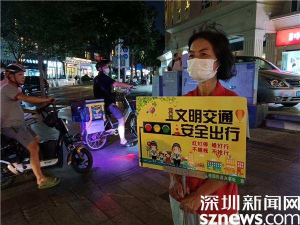 另一位堅(jiān)守在國慶假期里的義工是宣仲英,今年62歲。她一站兩個(gè)小時(shí),始終是精神抖擻,毫不松懈??吹接腥嗽噲D闖紅燈,她及時(shí)制止??吹接腥瞬蛔甙唏R線,她立刻提醒。她手持勸導(dǎo)文明出行的牌子,就像個(gè)交通警察,誰也別想在她的面前犯規(guī)。本來下午6點(diǎn)鐘,正是她給家人做晚餐,同家人一起吃飯的時(shí)間,但她聽說社區(qū)創(chuàng)文需要人,就跟家人商量,得到了家人的一致同意。她說,“我從內(nèi)地來到深圳,在老圍社區(qū)住了10年,感覺深圳做義工的氛圍特別濃厚,我也想做義工,為社會(huì)發(fā)揮余熱。”