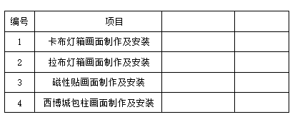 二、項(xiàng)目概況:本次大媒體廣告制作、安裝服務(wù)采購項(xiàng)目進(jìn)行制作、安裝單位供應(yīng)商的招標(biāo),歡迎符合資格的單位參加投標(biāo)。采購范圍見下表: