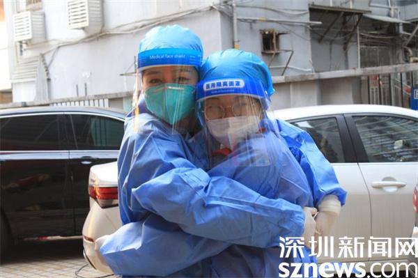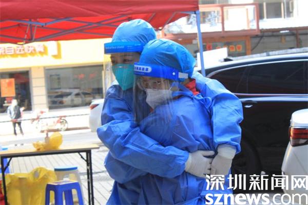1月11日,深圳突然降溫,風(fēng)大天冷。北風(fēng)呼嘯中,羅湖區(qū)桂園街道老圍社區(qū)禧程酒店的臨時(shí)檢測點(diǎn)帳篷差點(diǎn)被掀翻。寒風(fēng)刺骨,社區(qū)工作人員和志愿者有條不紊地引導(dǎo)市民有序采樣。工作人員在“風(fēng)口浪尖”上站得久了,被吹得全身透涼,手指頭都冷僵了。瞬間,兩名志愿者緊緊擁抱在一起,相互取暖,以示鼓勵(lì)。隨后,又立刻回到各自崗位,投入緊張的工作中。