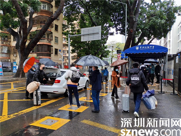 上午8:00左右,深圳市羅湖高級(jí)中學(xué)高三學(xué)子陸續(xù)返校。大雨雖然下個(gè)不停,但是學(xué)生們返校的心情卻絲毫沒有受到影響。在校門口,老師、學(xué)校物業(yè)工作人員為學(xué)生們撐傘、對(duì)行李進(jìn)行消毒、協(xié)助掃碼填報(bào)信息,有序幫助學(xué)生接過行李并用小推車運(yùn)送至宿舍樓。“這次開學(xué)和以往開學(xué)有所不同,我的感觸也很深。下著大雨,老師們忙前忙后為我們運(yùn)送行李,覺得非常感動(dòng)。”羅湖高級(jí)中學(xué)高三學(xué)子張睿說道。