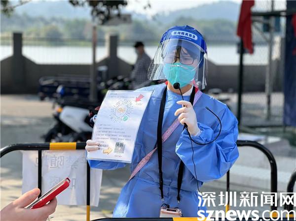 在大望體育公園核酸檢測點,身穿藍(lán)色防護(hù)服的吳連英舉著核酸檢測二維碼,站在居民隊伍中,一邊耐心地引導(dǎo)居民操作,一邊還不忘回答居民的問題。身材嬌小的她,在隊伍中站得筆直;眼疾手快的動作,是社工隊伍里有名的“高效率”;和藹可親的語氣,讓居民們親切地稱呼她為“阿英”。
