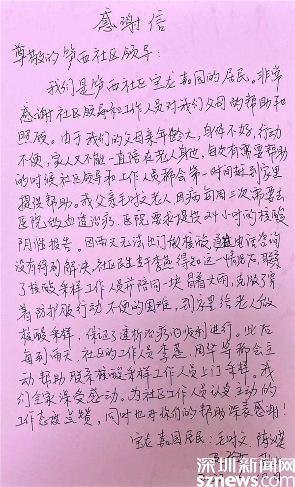 近日,羅湖區(qū)筍崗街道筍西社區(qū)寶龍嘉園住戶毛時(shí)文的老伴陳漢英阿姨來到筍西社區(qū)工作站,送上了一封手寫的感謝信,感謝社區(qū)提供貼心的上門核酸采樣服務(wù)。