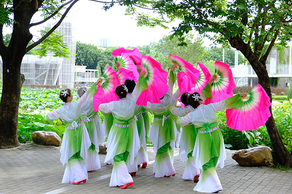 走進公園,映入眼簾的是一望無際的荷葉。一陣微風拂過,嫩綠的蓮蓬輕輕點頭,碩大的荷葉隨風搖擺,讓人心曠神怡。荷塘邊,身著紅色連衣裙的阿姨們正隨著音樂舞動;池塘的另一頭,身著碧綠服裝的阿姨們熱情洋溢地表演著扇子舞。