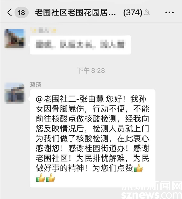 讀特客戶端·深圳新聞網(wǎng)2022年7月14日訊(記者 劉嘉敏 通訊員 楊紀(jì)歐)7月12日晚上8點(diǎn)多,羅湖區(qū)桂園街道老圍社區(qū)的居民琦琦在居民微信群里向社工張由慧說(shuō):“您好!我孫女因骨腳崴傷,行動(dòng)不便,不能前往核酸點(diǎn)做核酸檢測(cè),經(jīng)我向您反映情況后,檢測(cè)人員就上門為我們做了核酸檢測(cè),在此衷心感謝您!感謝桂園街道辦!感謝老圍社區(qū)!為民排憂解難,為民做好事的精神!為你們點(diǎn)贊?!?/p>