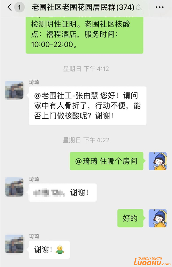 事情還要從7月10日的下午說(shuō)起,正在家休息的張由慧,看到琦琦在社區(qū)居民群里求助:“@老圍社工-張由慧?您好!請(qǐng)問(wèn)家中有人骨折了,行動(dòng)不便,能否上門做核酸呢?謝謝!”張由慧立刻回復(fù):“您的房間號(hào)(是什么)?”得到房間號(hào)后,張由慧通知社區(qū)網(wǎng)格員肖祥昌協(xié)助核實(shí)情況。肖祥昌從網(wǎng)格系統(tǒng)中找到琦琦的聯(lián)系方式,一通電話后,了解到琦琦的孫女不小心崴傷了腳,行動(dòng)不便,無(wú)法下樓做核酸。肖祥昌把情況通報(bào)給張由慧,張由慧立刻向社區(qū)黨委副書(shū)記黃小龍做了報(bào)備。