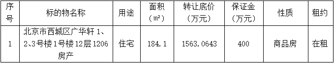 深圳報(bào)業(yè)集團(tuán)委托北京產(chǎn)權(quán)交易所對(duì)北京市西城區(qū)廣華軒1、2、3號(hào)樓1號(hào)樓12層1206房產(chǎn)進(jìn)行公開(kāi)掛牌交易,北京產(chǎn)權(quán)交易所現(xiàn)已公開(kāi)披露以下轉(zhuǎn)讓信息,廣泛征集受讓方。請(qǐng)有意者登錄北京產(chǎn)權(quán)交易所官方網(wǎng)站報(bào)名辦理意向受讓申請(qǐng)。