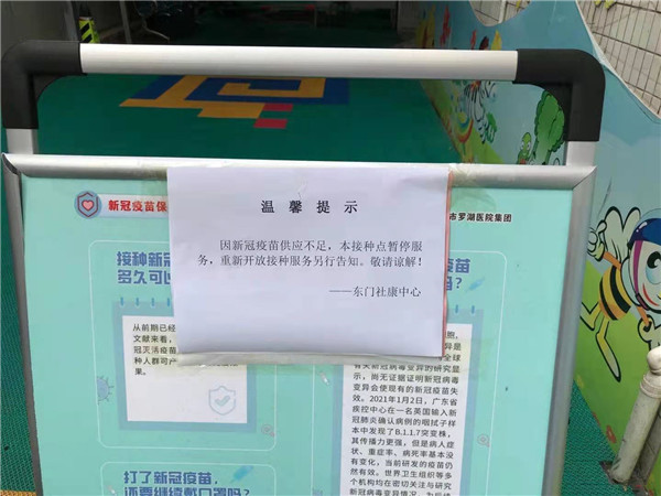 4月6日,記者在羅湖區(qū)東門社康中心看到,該社康貼出了疫苗暫時(shí)供應(yīng)不足的告知。記者隨后走訪了其他幾個(gè)接種點(diǎn),一些社康也紛紛貼出了類似溫馨提示。記者了解到,除羅湖外,其他區(qū)的接種點(diǎn)也出現(xiàn)了類似“缺苗”現(xiàn)象。對(duì)此,記者采訪了羅湖區(qū)衛(wèi)健局,相關(guān)負(fù)責(zé)人表示,這段時(shí)間轄區(qū)新冠病毒疫苗接種率大幅提升,目前缺苗只是暫時(shí)性的,正在加強(qiáng)調(diào)配,隨時(shí)可能到苗,請(qǐng)大家耐心等待,同時(shí)留意相關(guān)提示。