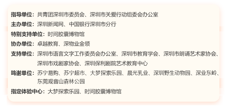 讓閱讀成為動(dòng)人的風(fēng)景,讓故事的魅力感動(dòng)深圳。為助力建設(shè)良好的青少年閱讀環(huán)境,激發(fā)學(xué)生閱讀興趣,倡導(dǎo)親子閱讀,共建和諧家庭關(guān)系。2020年,第二十一屆深圳讀書月主題活動(dòng)“誰是故事大王·第四季”在共青團(tuán)深圳市委員會(huì)、深圳市關(guān)愛行動(dòng)組委會(huì)辦公室的指導(dǎo)下再出發(fā)。更長的活動(dòng)周期,更豐富的參與形式,更專業(yè)的賽制,“誰是故事大王·第四季”等你來解鎖與挑戰(zhàn)!