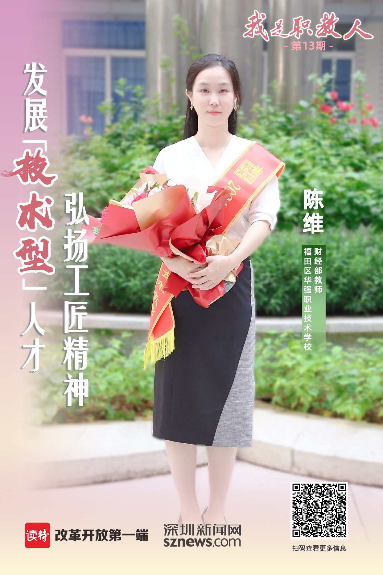 “對生活有熱愛,才會變得有趣;對生活和世界保持好奇心,才能擁有創(chuàng)造力和想象力?!睆氖侣殬I(yè)教育的第十年,深圳市福田區(qū)華強職業(yè)技術(shù)學(xué)校財經(jīng)部老師陳維,始終期望學(xué)生成為有趣、有技術(shù)、有創(chuàng)造力,能為社會做出貢獻的人。