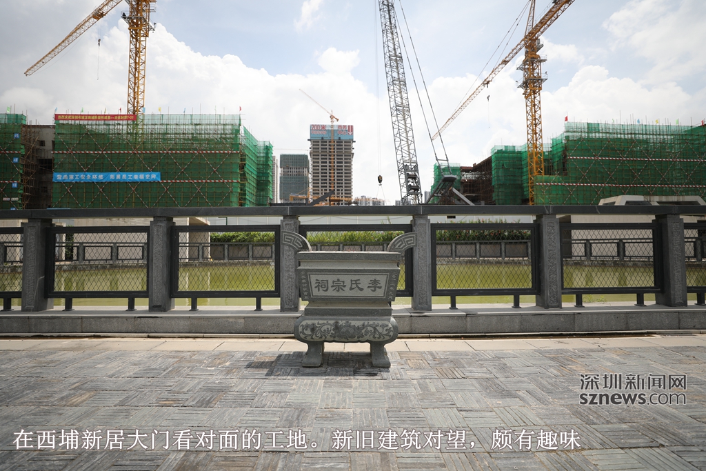 我們到訪西埔新居的時(shí)候,周邊的工地正如火如荼開(kāi)工,運(yùn)送建筑材料的貨車(chē)從西埔新居一側(cè)的通道進(jìn)進(jìn)出出,站在圍屋前的半月形池塘,就可看到高大的吊車(chē)和迅速長(zhǎng)高的現(xiàn)代樓宇,村里安靜,村外喧囂,兩個(gè)世界。