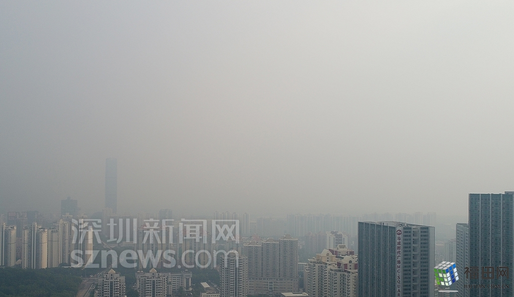 無人機在數(shù)百米高空俯瞰灰霾籠罩下的深圳中心區(qū),大半個城區(qū)都看不清楚。