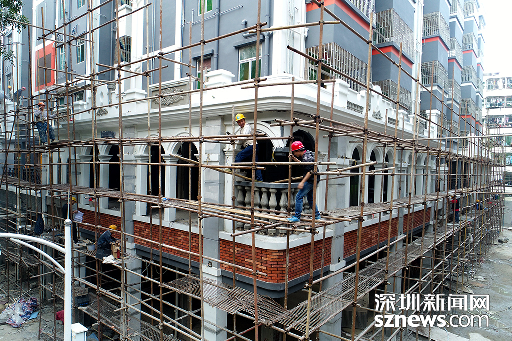 12月14日下午,水圍村改造的村民房的建筑鋼架還沒(méi)有拆除,建筑工人正在對(duì)外立面進(jìn)行粉刷