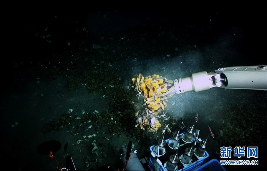 “深海勇士”號在“海馬冷泉”進(jìn)行科學(xué)采樣的情景(5月20日攝)。新華社記者 張建松 攝