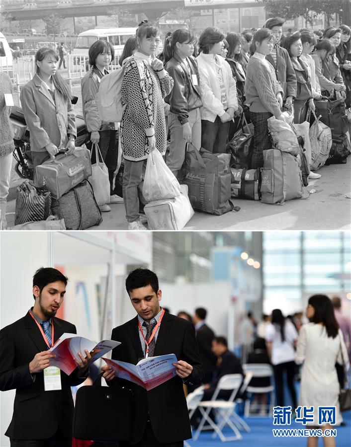 拼版照片:上圖為在深圳打工的外地務(wù)工者在火車站候車,準(zhǔn)備回家探親(資料照片,新華社記者潘家珉攝);下圖為2015年4月18日,在深圳舉行的第13屆中國國際人才交流大會上,兩位外籍應(yīng)聘者查看職位情況(新華社記者毛思倩攝)。新華社發(fā)