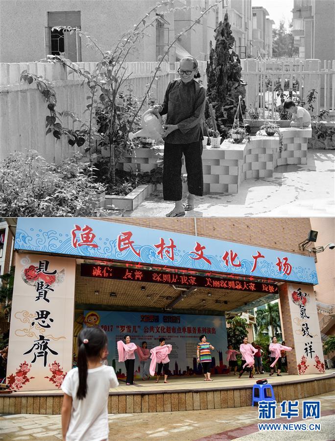 拼版照片:上圖為深圳漁民村退休老人在庭院里侍弄花木(資料照片,新華社記者潘家珉攝);下圖為2017年9月7日,漁民村的居民在社區(qū)文化廣場排練舞蹈(新華社記者毛思倩攝)。新華社發(fā)