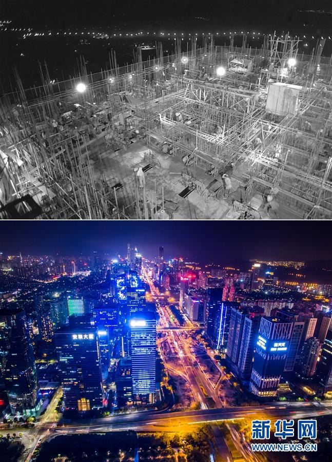 拼版照片:上圖為建筑工人在深圳國際貿(mào)易中心大廈工地工作(資料照片,新華社記者陳學(xué)思攝);下圖為2017年2月14日無人機(jī)拍攝的深圳夜景(新華社記者毛思倩攝)。新華社發(fā)