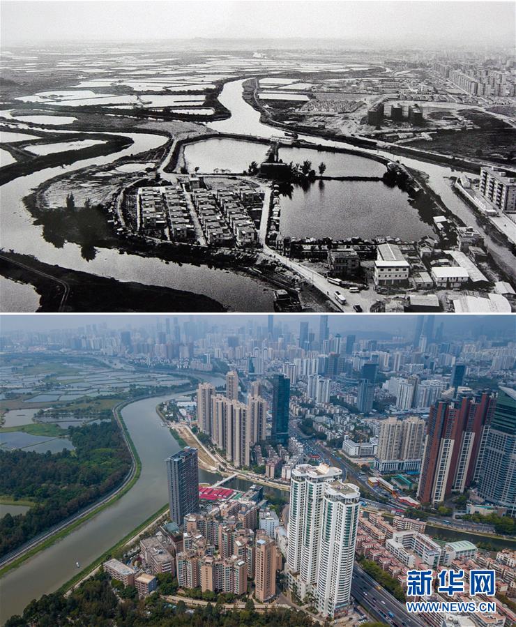 拼版照片:上圖為上世紀(jì)80年代初的深圳漁民村(資料照片,新華社發(fā));下圖為2018年3月26日無人機(jī)拍攝的漁民村(畫面前面的高樓,新華社記者毛思倩攝)。漁民村坐落于深圳河畔,從上世紀(jì)70年代水草飄零的漁船人家到改革開放以來中國第一個“萬元戶村”,如今已經(jīng)變成加載高科技設(shè)備實現(xiàn)智能化管理的現(xiàn)代社區(qū)。新華社發(fā)