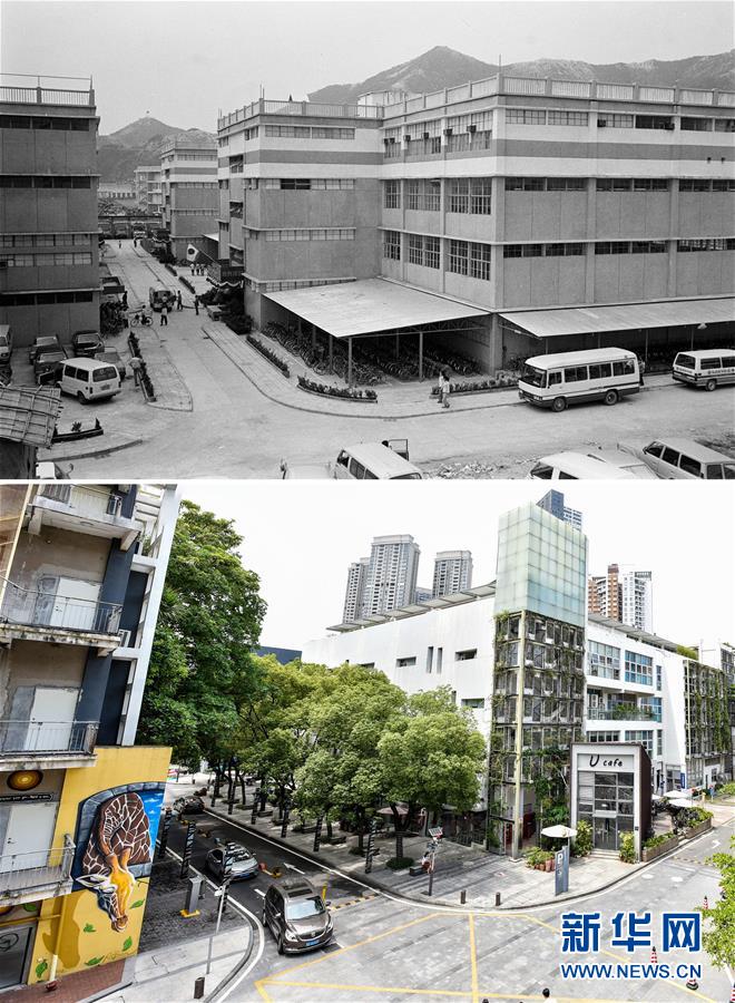 拼版照片:上圖為位于深圳南頭半島上的南油開發(fā)區(qū)(資料照片,新華社記者張肄文攝);下圖為2018年6月20日拍攝的原南油開發(fā)區(qū)(新華社記者毛思倩攝)。新華社發(fā)
