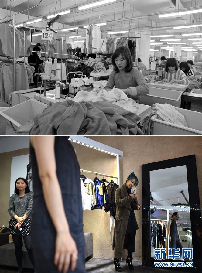 拼版照片:上圖為工人在深圳蛇口工業(yè)區(qū)一家服裝生產(chǎn)企業(yè)車間工作(資料照片,新華社記者段文華攝);下圖為2015年3月28日,獨立服裝品牌“Mansion魯遇”創(chuàng)始人魯遇(右)在位于深圳南山區(qū)的工作室內(nèi)查看模特試穿新款服裝(新華社記者毛思倩攝)。深圳從服裝代工基地轉(zhuǎn)型為服裝品牌聚集地,成為中國服裝產(chǎn)業(yè)轉(zhuǎn)型升級的樣本。新華社發(fā)
