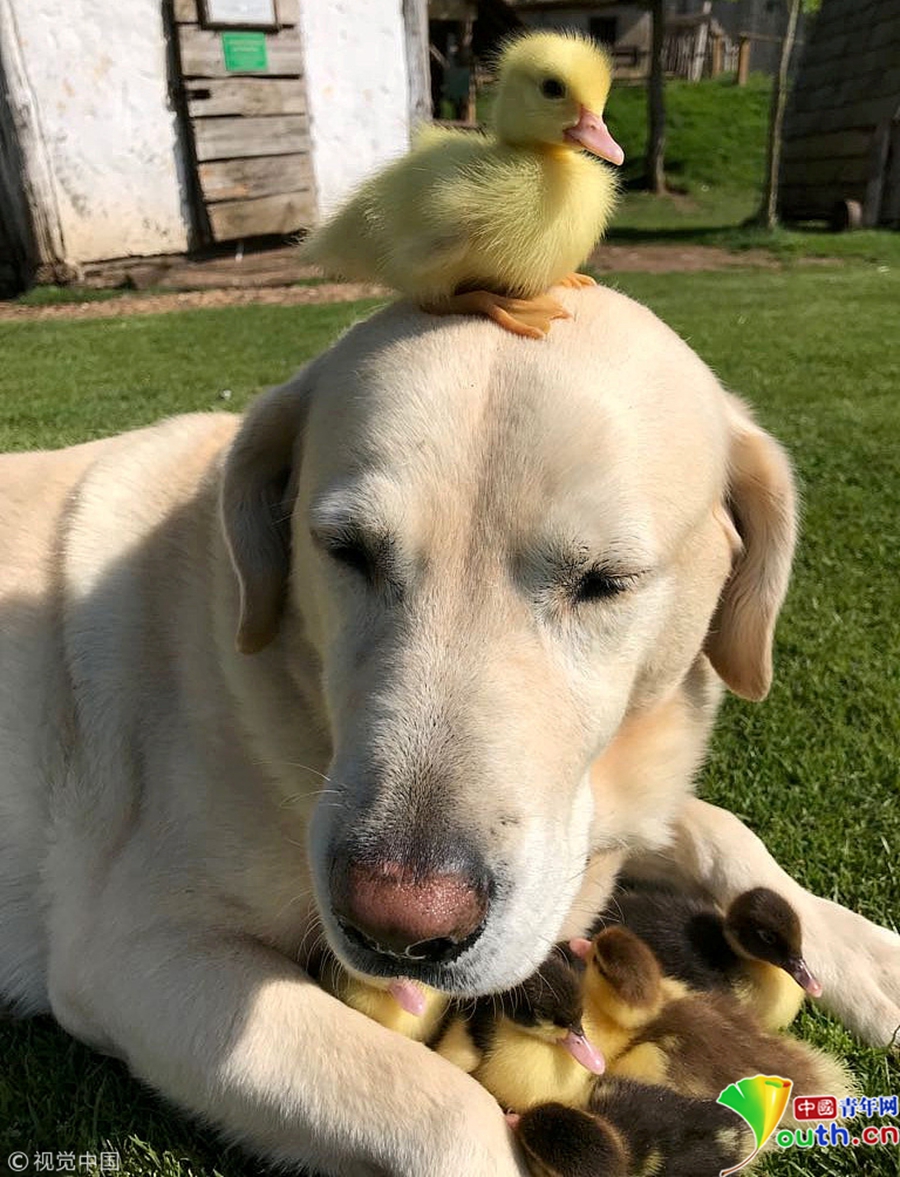 2018年5月22日訊(具體拍攝時間不詳),英國艾塞克斯郡芒特菲奇特城堡,一只名為弗雷德的拉布拉多和它“收養(yǎng)” 的9只小鴨子。小鴨子的媽媽突然失蹤,10歲的弗雷德就成了它們的“新爸爸”。圖片作者/視覺中國