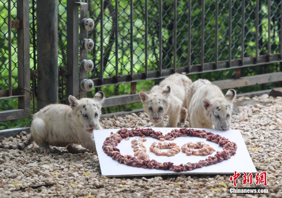 7月10日,雪虎五胞胎分享“肉餡蛋糕”。當(dāng)日,濟南野生動物世界五胞胎雪虎誕生滿百日,正式與游客見面。中新社記者 張勇攝