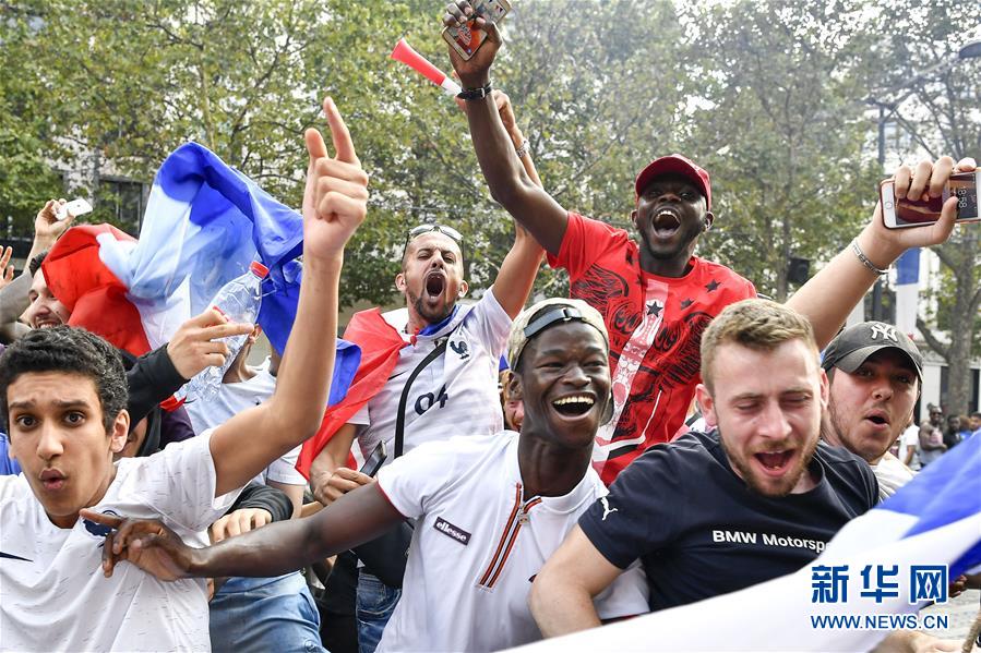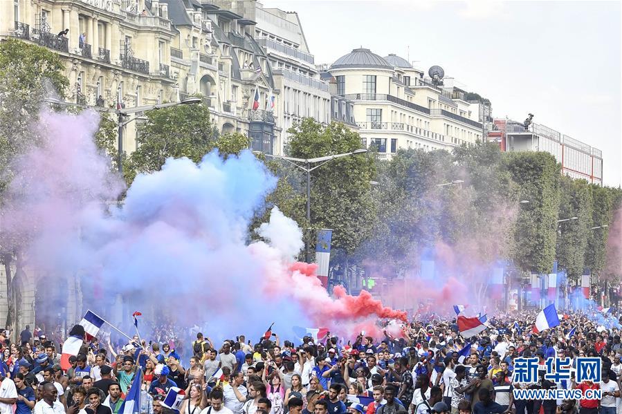 7月15日,法國(guó)球迷在巴黎香榭麗舍大街上慶祝法國(guó)隊(duì)奪冠。