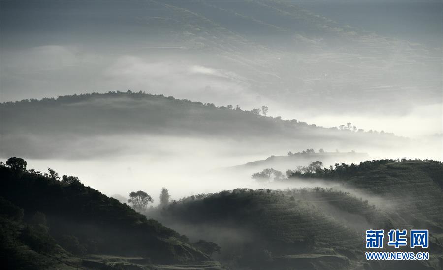 云霧繚繞的寧夏彭陽縣金雞坪梯田公園(7月17日攝)。