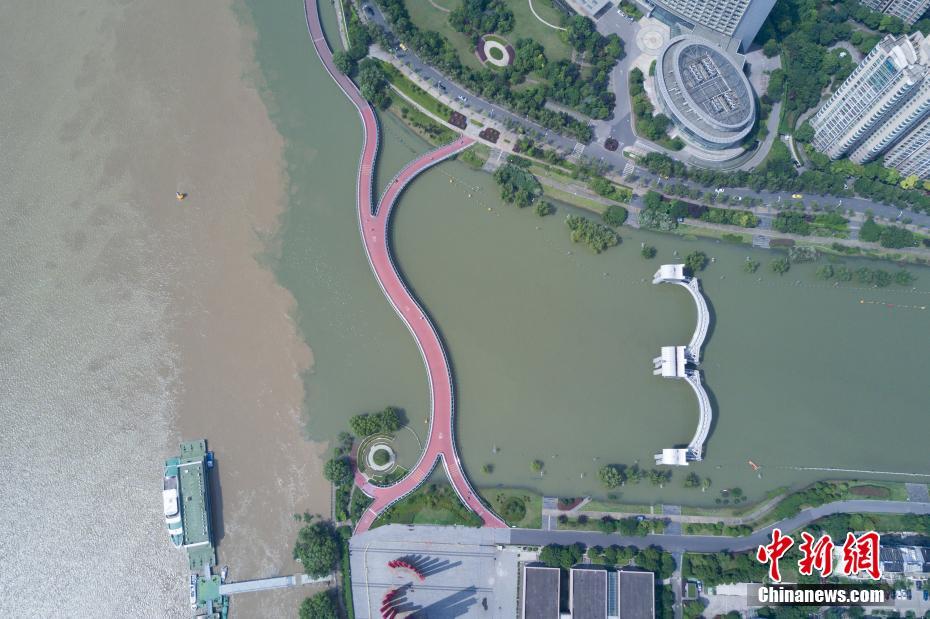 7月10日,航拍長江與南京秦淮河交匯處,江水與河水“涇渭分明”。當(dāng)日,江蘇水利廳發(fā)布的水情信息顯示,長江南京段水位已降至警戒線以下。中新社記者泱波 攝