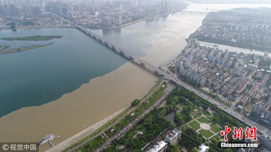 5月7日,湖北省襄陽市,無人機(jī)航拍的漢江長(zhǎng)虹大橋處涇渭分明的漢江水面。強(qiáng)暴雨沖刷經(jīng)過去冬今春的田野地表積累的塵土,經(jīng)支流與主河道匯入時(shí),充滿污泥的洪水與主河道上清澈的丹江水形成難得一見的涇渭分明景觀。王虎攝 圖片來源:視覺中國(guó)