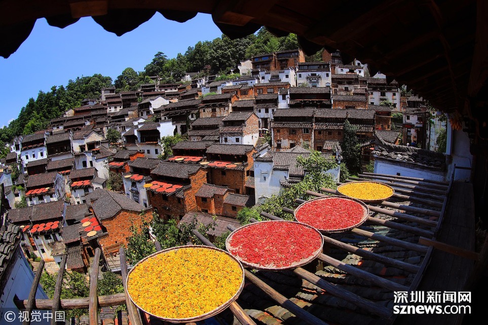 ??? 深圳新聞網(wǎng)訊 2018年8月7日,江西婺源縣篁嶺古村落,壯觀“曬秋”場景。當日立秋節(jié)氣,江西婺源縣篁嶺古村的農(nóng)作物普遍豐收,村民們又迎來了一年一度的“曬秋”季。村民們將收獲來的紅辣椒、玉米、南瓜、稻谷和菊花等色彩斑斕的農(nóng)作物,晾曬在依山而建的徽派民居房前屋后的木制曬架上,在秋日陽光的照射下,色彩繽紛圓圓的曬扁,鋪就在錯落有致的徽派民居之間,格外璀璨奪目,蔚為壯觀。目前,“篁嶺曬秋”已經(jīng)成為中國鄉(xiāng)村旅游的一張名片。