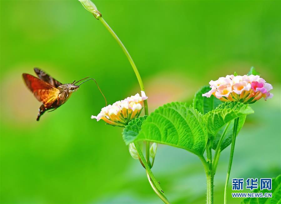 在福建省福州市溫泉公園,蜂鳥(niǎo)鷹蛾在花間飛舞(8月18日攝)。近日,福建省福州市溫泉公園內(nèi)的馬纓丹大面積開(kāi)放?;t、草綠、蟲(chóng)飛,構(gòu)成了一幅和諧的閩都生態(tài)圖景。 新華社記者梅永存攝