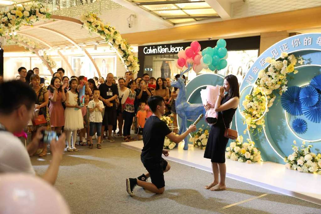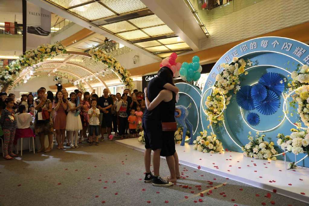 開幕式當(dāng)天,潤金店工作人員還配合市民楊先生上演了一場浪漫的“求婚大作戰(zhàn)”。原來,數(shù)日前,楊先生到潤金店表示要買一枚與眾不同的戒指向女友求婚。在銷售顧問的建議下,楊先生選購了一枚藍(lán)寶石戒指作為求婚信物。得知楊先生的心意后,潤金店品牌策劃部決定與楊先一起在七夕當(dāng)天完成這場浪漫的“求婚大作戰(zhàn)”。當(dāng)天,楊先生帶著毫不知情的女友來到潤金店“炫出色彩 耀你不凡”VIP品鑒會(huì)現(xiàn)場。正當(dāng)女友全神貫注欣賞小提琴、拉丁舞等開幕式表演節(jié)目時(shí),楊先生從兜里掏出事先準(zhǔn)備好的藍(lán)寶石戒指,單膝跪地向一臉茫然的女友喊:“嫁給我吧?!贝藭r(shí),開幕式現(xiàn)場背景音樂“配合”地?fù)Q成了甜蜜的《今天你要嫁給我》。感動(dòng)得熱淚盈眶的女友在圍觀市民的歡呼中,拉起了楊先生,并答應(yīng)了他的求婚。圍觀市民表示“七夕不過是路過,卻不料狠狠地吃了一把狗糧?!?/p>