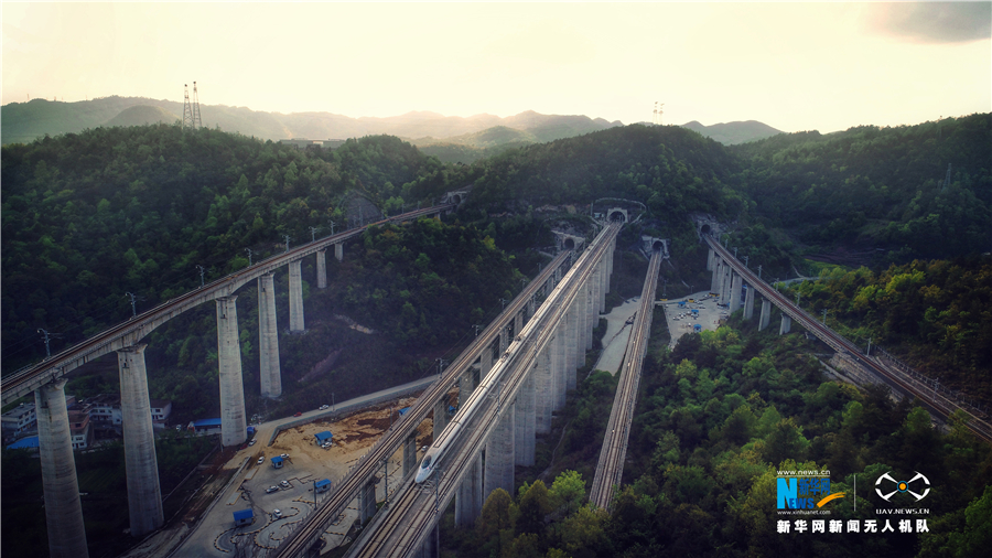 貴州省地處中國西南腹地,全省高原山地居多,因此高鐵建設(shè)的橋隧占比較高。在貴陽市烏當(dāng)區(qū)新添寨,高鐵滬昆線、貴廣客運專線、貴開城際客運專線的隧道和橋梁交織在一起,形成“五洞五橋”并行,形似“五龍出海”的壯觀景象(3月29日攝)。新華網(wǎng)盧志佳 攝