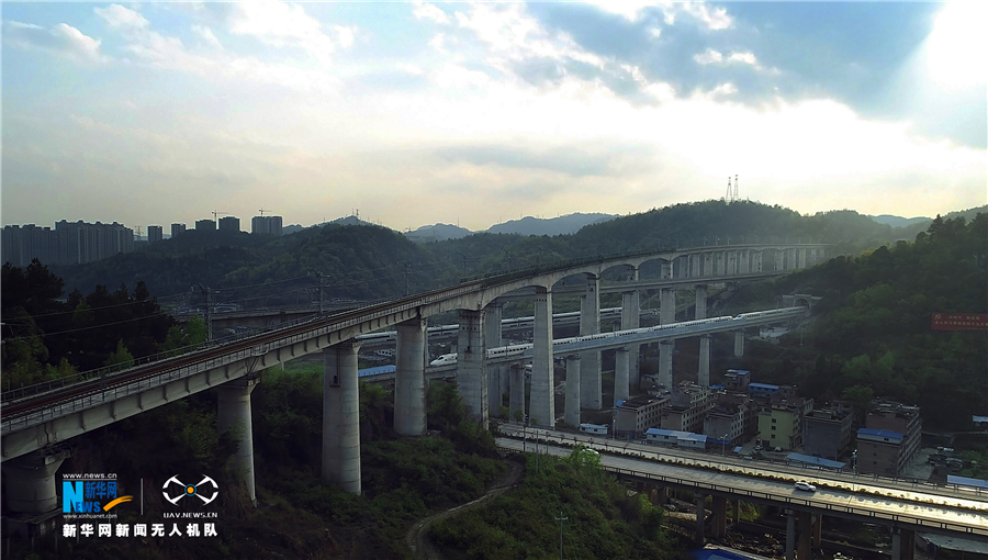 貴州省地處中國西南腹地,全省高原山地居多,因此高鐵建設(shè)的橋隧占比較高。在貴陽市烏當(dāng)區(qū)新添寨,高鐵滬昆線、貴廣客運(yùn)專線、貴開城際客運(yùn)專線的隧道和橋梁交織在一起,形成“五洞五橋”并行,形似“五龍出?!钡膲延^景象。圖為3月29日,新華網(wǎng)無人機(jī)航拍兩輛動車在線路上會車。新華網(wǎng)周遠(yuǎn)鋼 攝