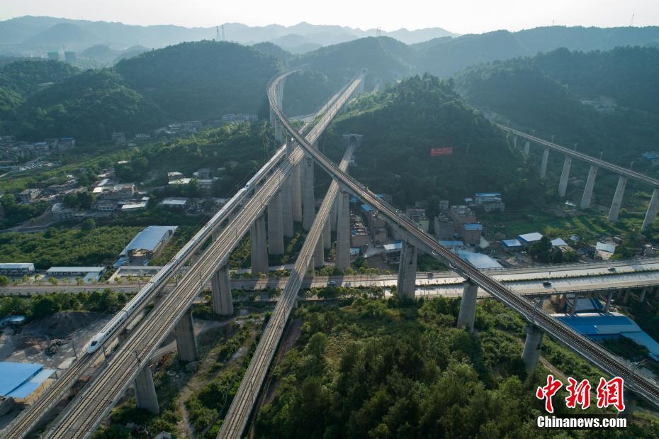 5月16日,航拍貴陽(yáng)市郊交織的五條高鐵線路,一列動(dòng)車駛出隧道。貴州省地處中國(guó)西南腹地,高原山地居多,因此高鐵建設(shè)的橋隧占比較高。在貴陽(yáng)市烏當(dāng)區(qū)新添寨,高鐵滬昆線、貴廣客運(yùn)專線、貴開(kāi)城際客運(yùn)專線的隧道和橋梁交織在一起,形成“五洞五橋”并行。中新社記者賀俊怡 攝