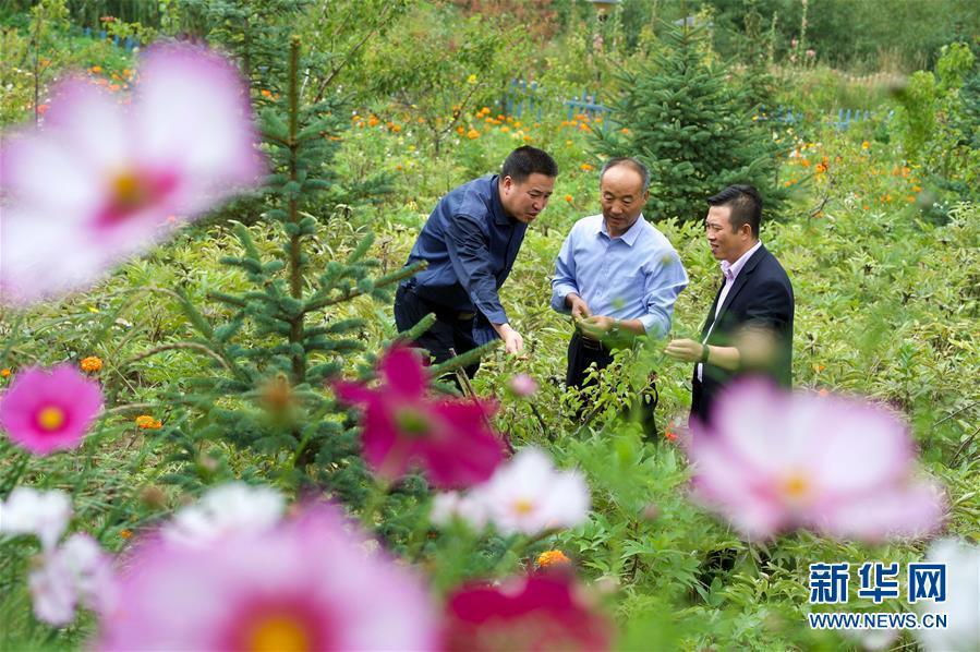 在寧夏固原市西吉縣吉強(qiáng)鎮(zhèn)龍王壩村,固原市農(nóng)業(yè)學(xué)校林業(yè)高級講師鄧志力(中)在指導(dǎo)村民進(jìn)行油用牡丹種植(8月30日攝)。