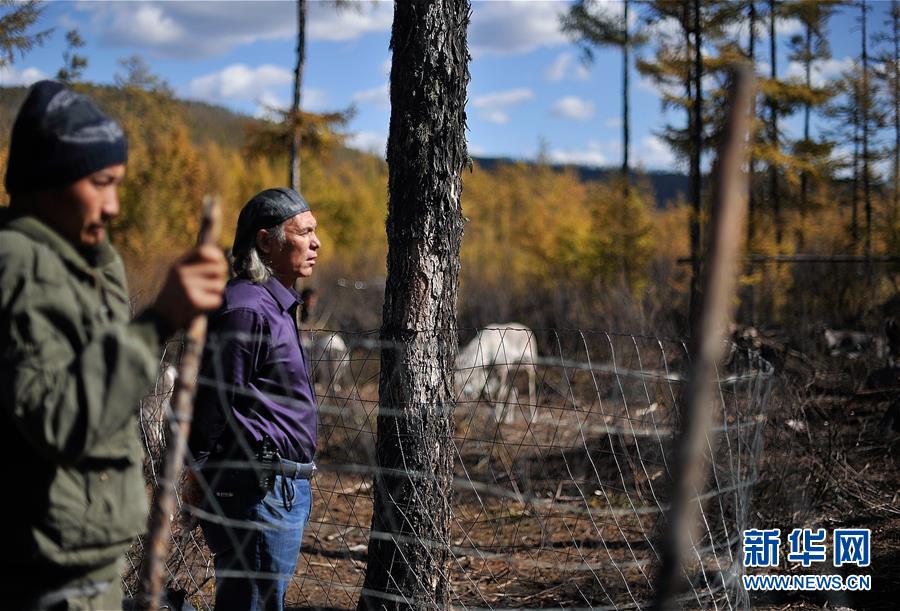 9月18日,在內(nèi)蒙古大興安嶺根河林業(yè)局約安里林場(chǎng),根河市敖魯古雅鄉(xiāng)獸醫(yī)站站長(zhǎng)古革軍(右)在鹿圈查看馴鹿。新華社記者于洋攝