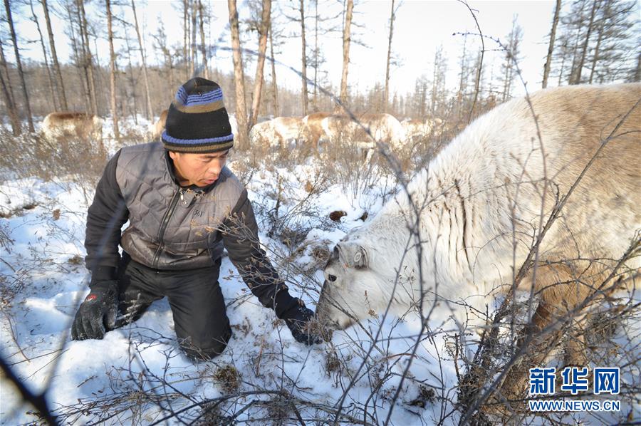 在內(nèi)蒙古大興安嶺根河林業(yè)局約安里林場(chǎng),林場(chǎng)職工張國(guó)華在喂養(yǎng)馴鹿(2017年12月23日攝)。新華社記者李任滋攝
