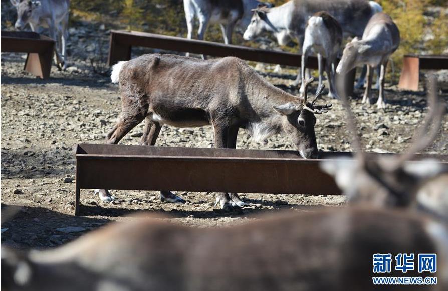 9月18日,一頭馴鹿在內(nèi)蒙古大興安嶺根河林業(yè)局約安里林場(chǎng)吃飼料。新華社記者鄒予攝