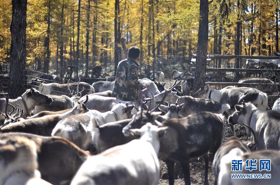 9月18日,在內(nèi)蒙古大興安嶺根河林業(yè)局約安里林場(chǎng),林場(chǎng)職工張國(guó)華要為馴鹿補(bǔ)充飼料。