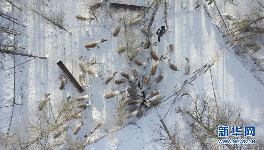 在內(nèi)蒙古大興安嶺根河林業(yè)局約安里林場(chǎng),林場(chǎng)職工張國(guó)華在鹿圈補(bǔ)充飼料(2017年12月23日無(wú)人機(jī)拍攝)。新華社記者李任滋攝